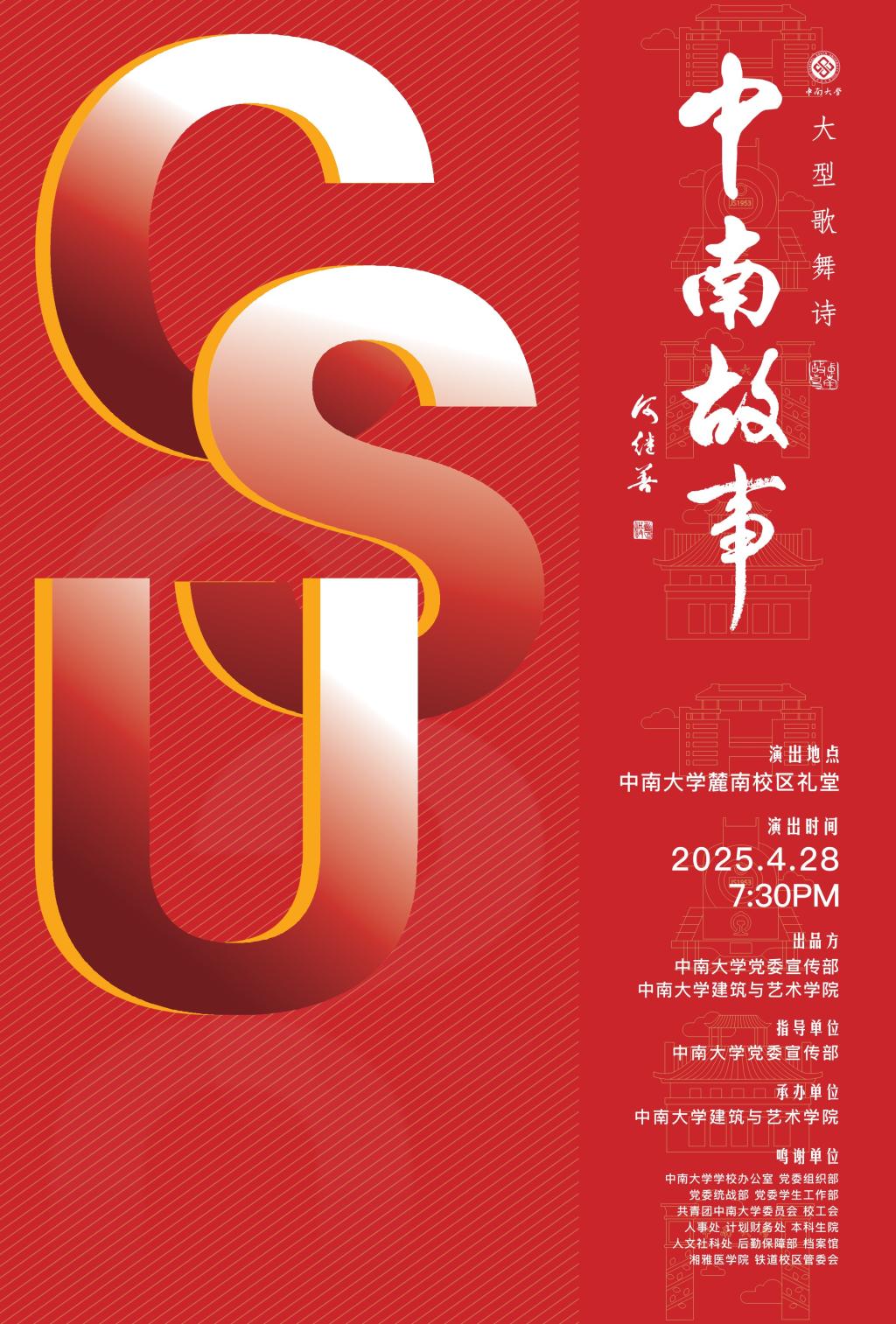 2025年4月28日晚7点30分,伟德中国官网入口匠心打造的原创大型歌舞诗《中南故事》将再度于伟德中国官网入口麓南校区礼堂璀璨启幕。作为“百年大学精神凝练与传承工程”的标志性成果,该剧肩负着双重文化使命:既以艺术之笔触深掘公司百年积淀的历史文化底蕴,亦以磅礴之姿奏响红色基因的传承强音。
