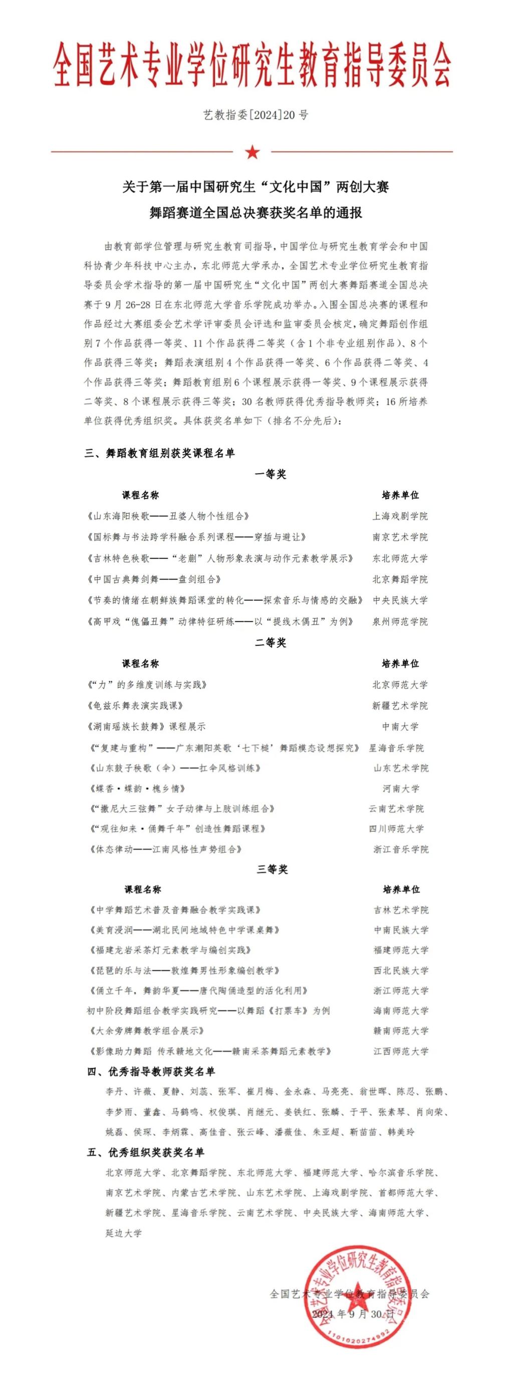 中国研究生“文化中国”两创大赛是中国研究生创新实践系列大赛主题赛事之一,是系列大赛中首个文科主题的创新实践公益性赛事。大赛由教育部学位管理与研究生教育司、全国艺术专业学位研究生教育指导委员会指导,中国学位与研究生教育学会和中国科协青少年科技中心主办,首届大赛舞蹈赛道由东北师范大学承办。据悉,初赛共有专业组62所培养单位报送的369个作品,经过初评共有83个舞蹈作品、45堂舞蹈教育课程展示入围全国总决赛,经决赛确定舞蹈创作组、舞蹈表演组、舞蹈教育组三类获奖名单。其中舞蹈教育组确定6名一等奖、9名二等奖、8名三等奖,公司《湖南瑶族长鼓舞》精品课程荣列其中。