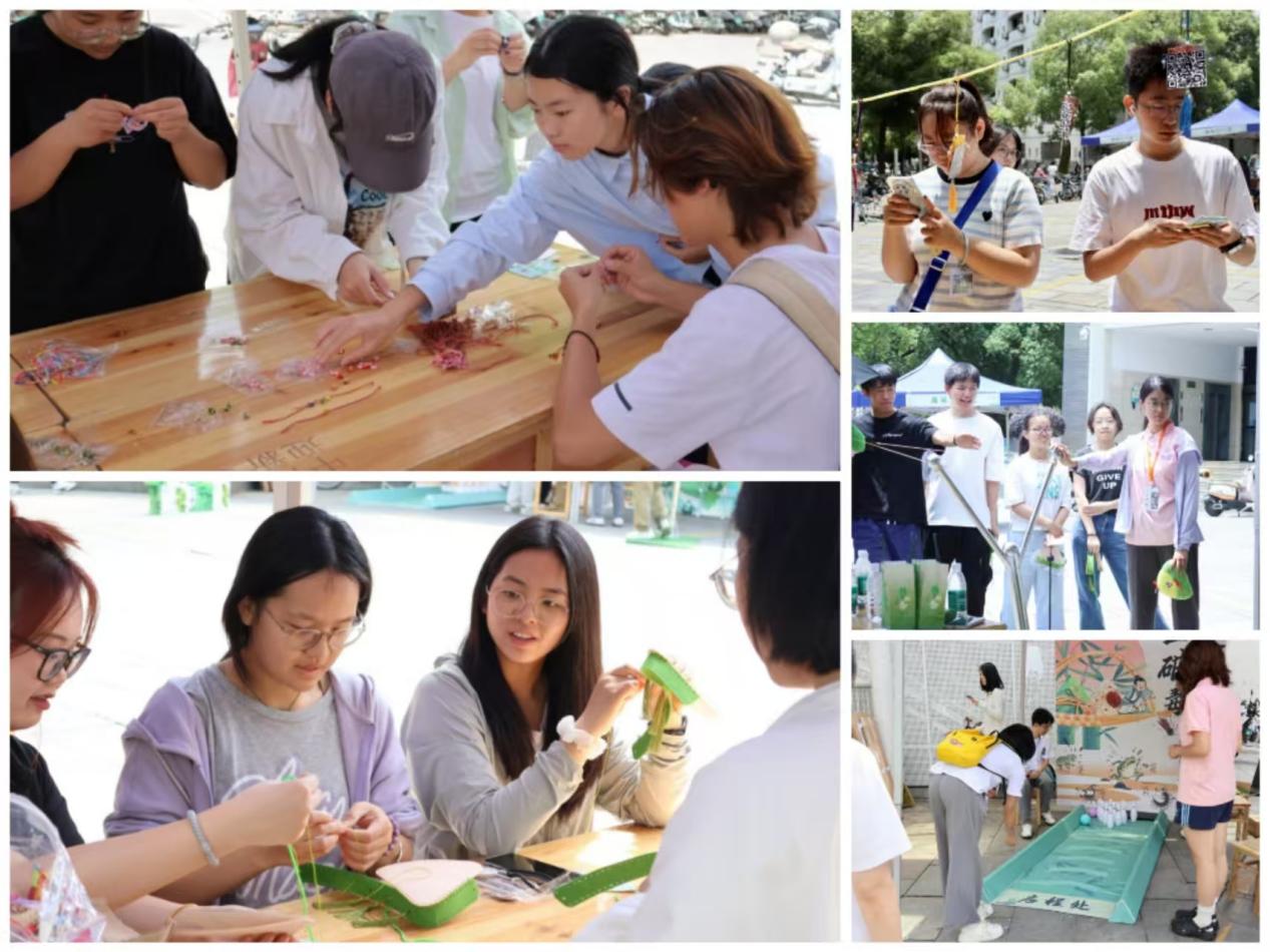 游园会现场活动丰富多彩,令人流连忘返。开场舞蹈表演以灵动的舞姿点燃了现场气氛;“粽香传情”体验区内,师生们在专业指导下亲手包制粽子,感受传统习俗的魅力;创意DIY区则提供了国风粽子斜挎包制作、五彩手绳编织等活动,将传统文化与现代创意巧妙结合;“保龄球破五毒”“一击即粽”等趣味游戏及知识问答环节,让参与者在轻松愉快的氛围中加深了对端午文化的了解。完成活动的师生还可凭集章兑换文创礼品,增添了节日的趣味性。