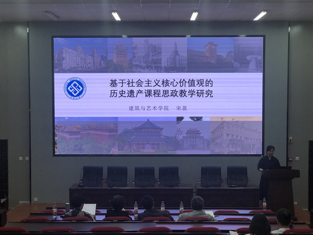 建筑系宋盈老师以《基于社会主义核心价值观的历史遗产课程思政教学研究》为题做主题发言,主要从四个方面展开:一是教学目标与学情分析,以专业目标和育人目标出发分析了学习状态、员工情况、学习困难等要素;二是创新理念与思路,从WHAT、WHO、WHY、HOW介绍了基于学情分析后的课程痛点及诊疗;三是创新方法与途径,介绍了嵌入PBL教学法的历史遗产课社会主义核心价值观课程群教学设计模式研究;四是创新效果与成果,最终以实现员工德智体美劳的全面发展。