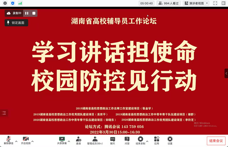 2022年3月30日下午3点,由伟德中国官网入口员工工作部(处)指导,高校思想政治工作队伍培训研修中心(伟德中国官网入口)支持,湖南省高校思想政治工作名师工作室、优秀团队、中青年骨干队伍等建设项目负责人张金学、袁世平、谢群、宋晓东、李玲芝牵头策划的“学习讲话担使命,校园防控见行动”高校辅导员工作论坛(线上)成功举办。