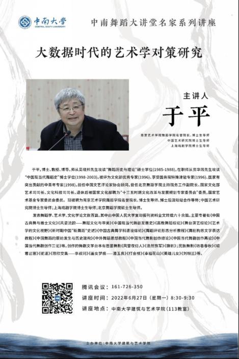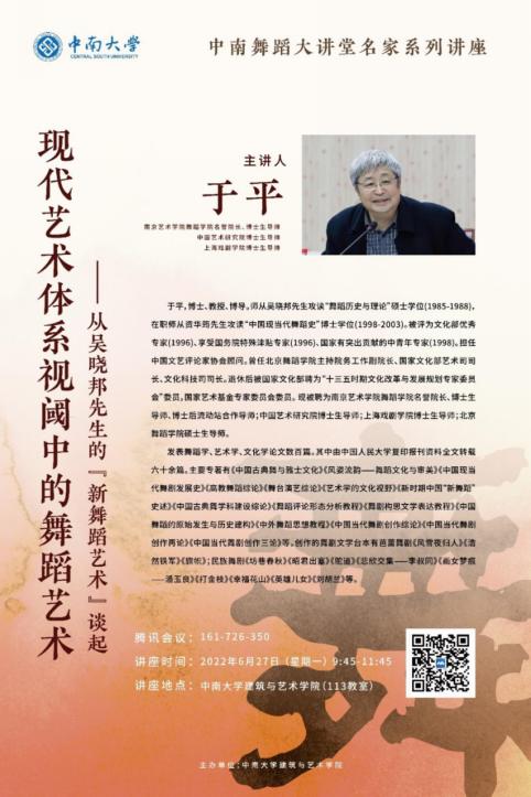 为进一步助力公司舞蹈表演专业的学术建设,扩宽师生学术视野,伟德中国官网入口特别邀请南京艺术公司舞蹈公司名誉经理、博士生导师、中国艺术研究院博士生导师、上海戏剧公司博士生导师于平教授,于6月27日上午在腾讯会议云端进行《大数据时代的艺术学对策研究》《现代艺术体系视阈中的舞蹈艺术——从吴晓邦先生的“新舞蹈艺术”谈起》两场专题讲座。公司舞蹈专业师生在公司113教室集中学习,讲座由龚倩教授主持,公司李博副经理为讲座致辞,代表公司对于平教授表示热烈欢迎。公司舞蹈专业负责人伍彦谚教授向于平教授表示了诚挚感谢。