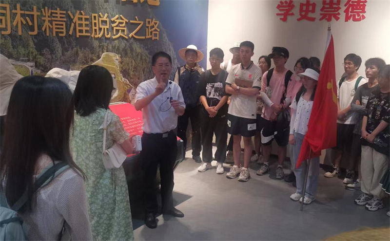 在精准扶贫展厅的党旗前,全体党员同志重温入党誓词,感悟使命担当。随后,张金学副书记为员工上了一节精彩的现场思政课。2013年11月3日,习近平总书记来到十八洞村,提出“实事求是、因地制宜、分类指导、精准扶贫”十六字方针,要求十八洞村精准扶贫模式要“可复制”、“可推广”。张金学副书记为同学们详细讲解了习近平总书记提出的十六字方针,生动叙述了当地党员干部“精准扶贫”的故事。如今八年过去,十八洞村已经有了翻天覆地的变化,处处是“云垂平野,掩映竹篱茅舍,阒寂幽居实潇洒,是处绿娇红冶”的景象。联系高校实际,他动情地给现场同学们说老员工村官、驻村干部、第一书记多来自于高校毕业生,希望同学们在成长、成才过程中,把自己的个人理想与党和国家的伟大事业紧密结合,走好自己的人生路。