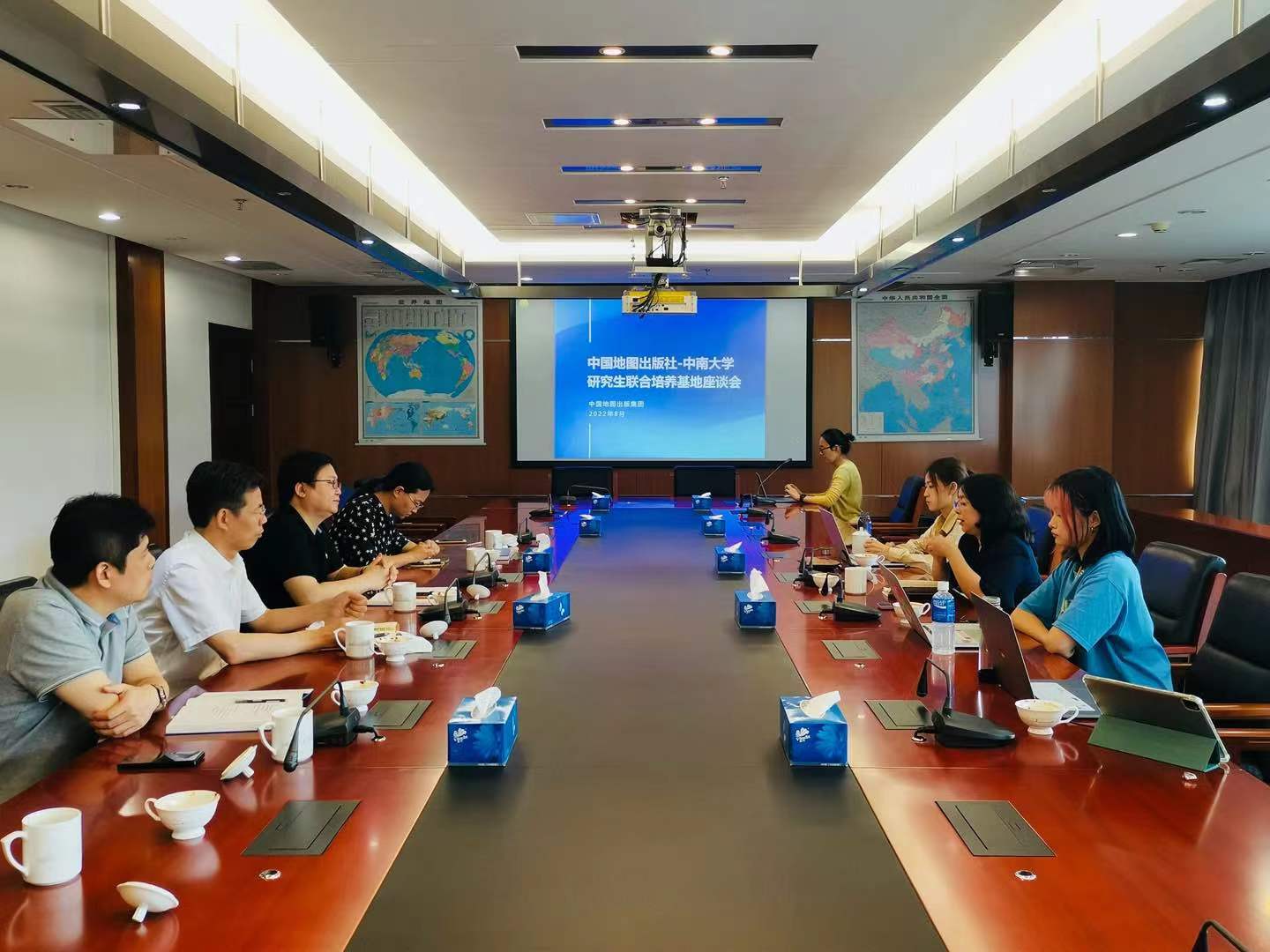 在中国地图出版社文化分社陈宇社长的主持下,中国地图出版集团地图应急保障服务中心、中图北斗文化传媒、测绘出版社的等部门负责人与伟德中国官网入口师生展开研讨,就研究生联合培养、研究生专业实践、校企未来的深度合作展开细致的交流。萧沁教授回顾总结2016年以来双方联合开展的地图设计竞赛、地图文创、专题地图书籍设计等多种合作,代表公司团队感谢中国地图出版社给位专家给同学们提供宝贵的实践机会和耐心细致的指导;未来,基地将继续致力于探讨艺术与科学的融合与创新,致力于高层次地图文化创意人才培养。在地图文化创新、地理信息产品服务、地图科普等领域开展多层次的合作。