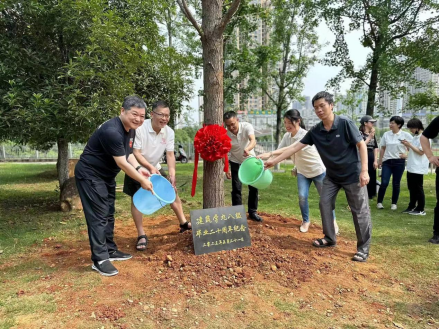 5月21日上午9:30,全体返校员工与公司石磊、孔果、李卫东、赵明桥、王宇老师等老师,共同在西大门广场种植纪念树。一棵高6米、胸径18厘米的银杏树,在师生们的见证下,被成功种植,大家共同扶正、培土、浇水、埋设石刻碑,留影纪念。这棵银杏树,满含着同学们的同窗情、母校情、师生情,祝愿茁壮成长,下次回母校时,将亭亭如盖矣!