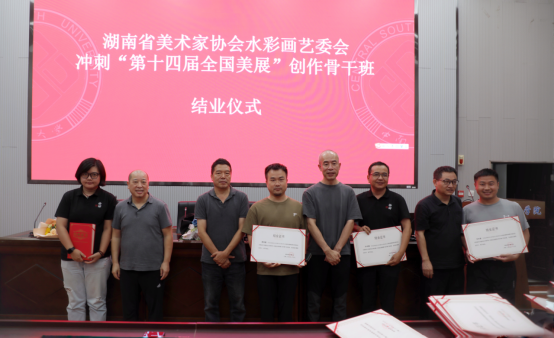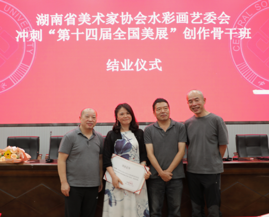 中国美术家协会水彩艺术委员会委员刘永健、陈流、董克诚,湖南美术家协会水彩艺术委员会主任唐晓明为学员颁发结业证书