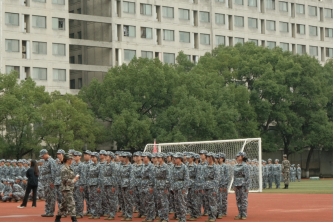 先是上身的原地摆臂训练,强调手臂摆动的角度和速度,以及手掌的动作:大拇指贴于食指第二个关节处,其余手指弯曲,指腹贴于手掌。同学们听得细心,学得认真。熟悉上身的训练后,下肢的训练也开始了。同样先是排长示范,再讲解动作注意的细节。动作教学完毕后,排长进行每排同学分组训练,检验训练成果。