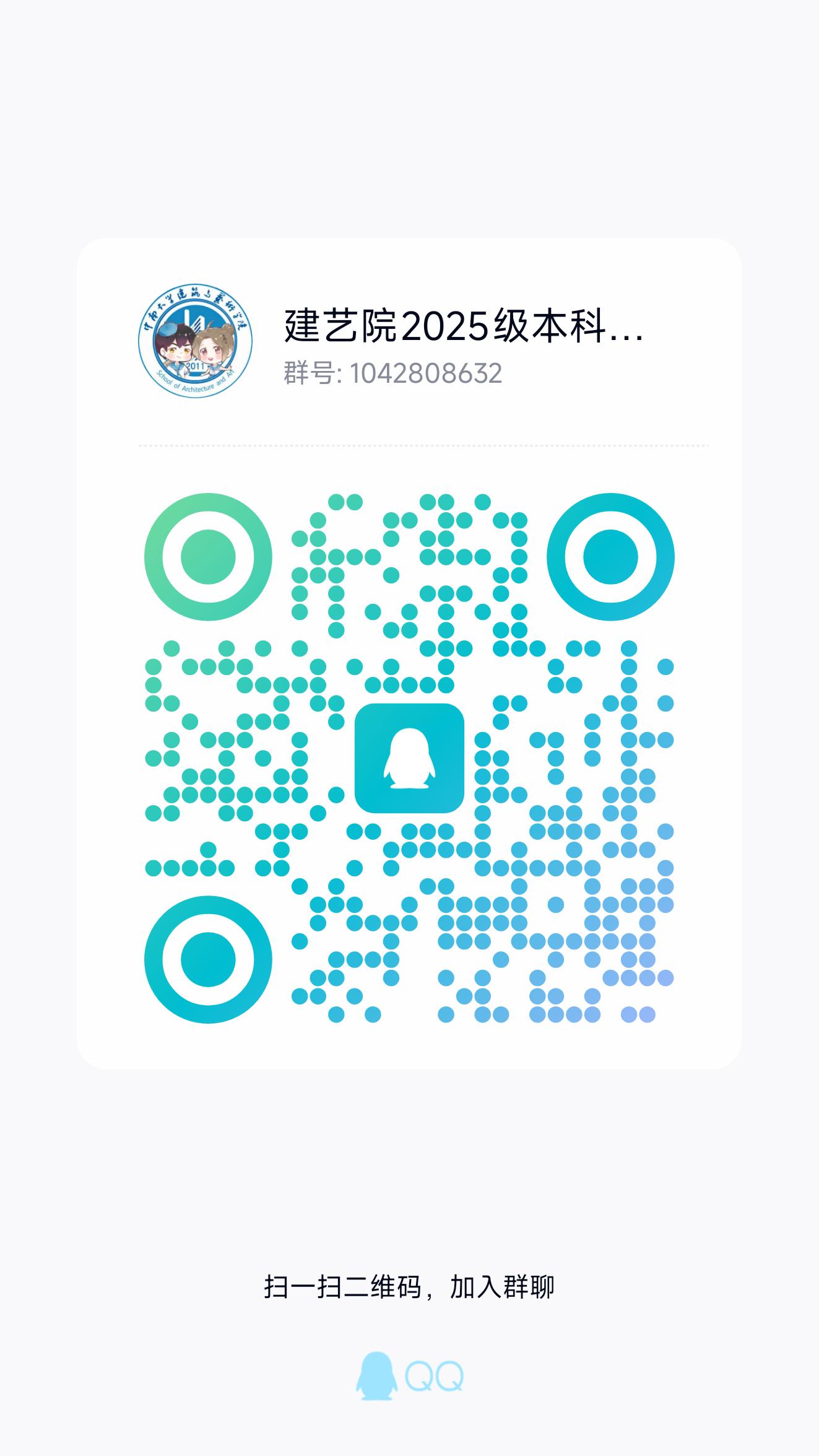 四、为更好地给新同学答疑解惑,公司已组建“建艺院2025级本科生QQ群”。请同学们扫描下方二维码申请入群,公司将根据招生办提供的录取名册进行身份核验。为便于管理,进群后请将自己的群昵称修改为:专业班级-省份简称-姓名-电话,范例:艺科/音表/舞表/建筑/城规2501-湘-张三-138XXXXXXXX。